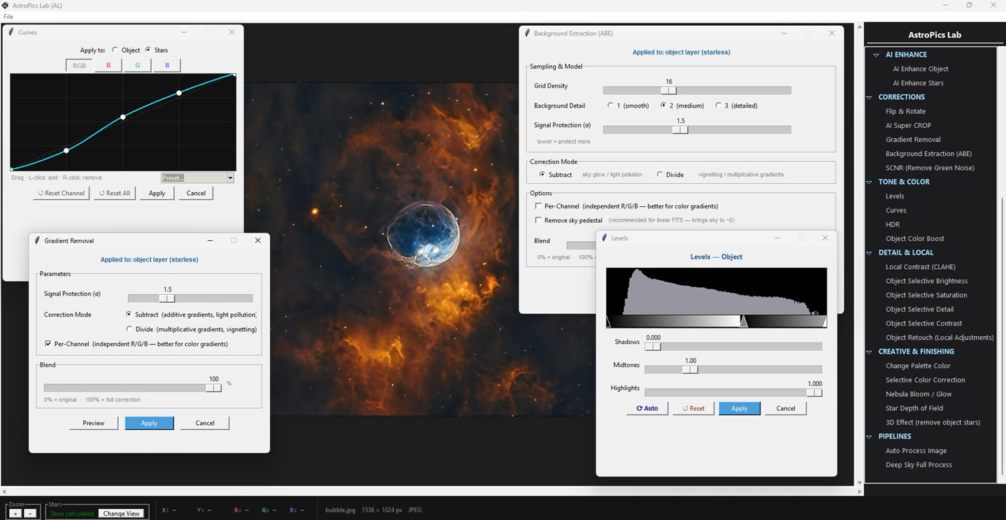 Remove noise, enhance object, remove/reduce stars, apply color automatically, upscale 2x image, autostretch, levels, curves, Gradient/Background removal, luminance layers, change palette, modify colors, 3d effects, enhance stars, etc.